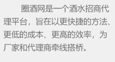 圈酒招商網主要為白酒、啤酒、葡萄酒、保健酒等酒類企業提供酒水招商、代理批發(fā)、加盟等信息